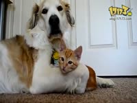 小猫对狗舌头感兴趣